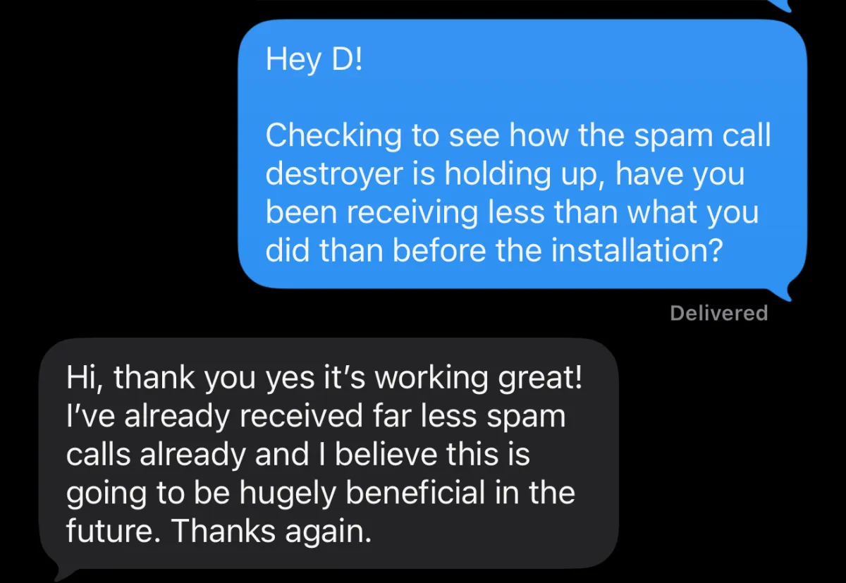 Now every ring has meaning. Your business feels calm, focused, and in control again. Spam Call Destroyer uses smart AI to filter fake calls instantly, letting only real customers through, all set up for you in under 24 hours.
